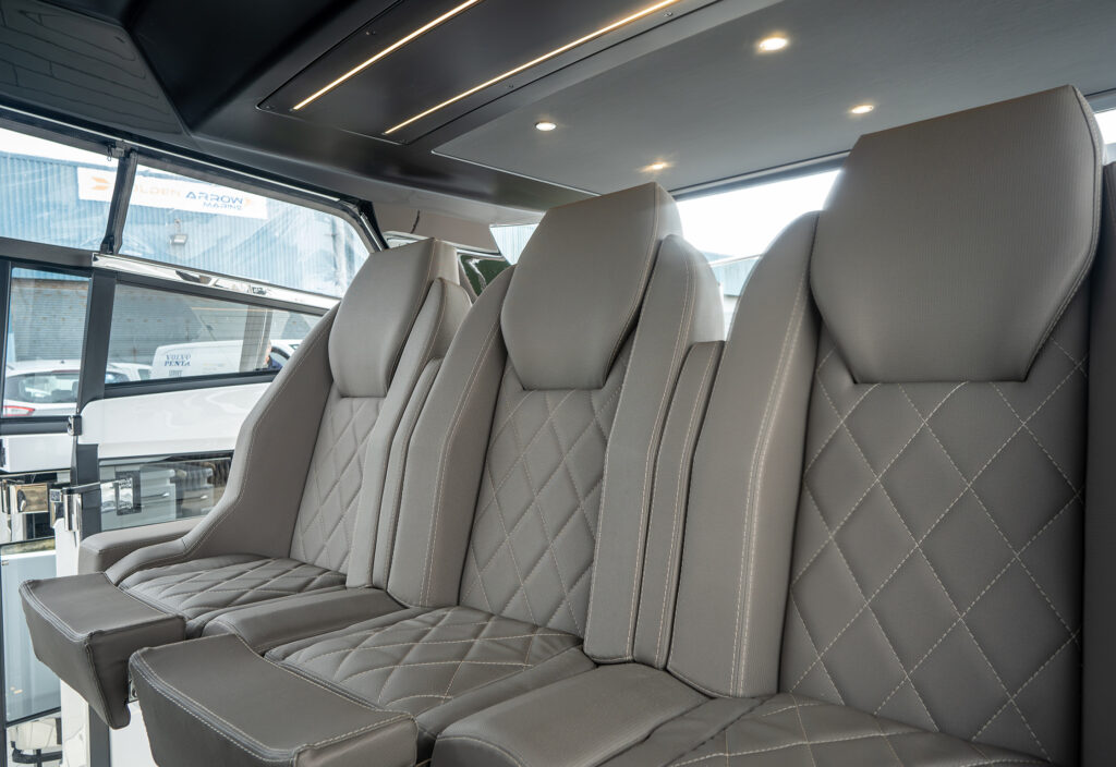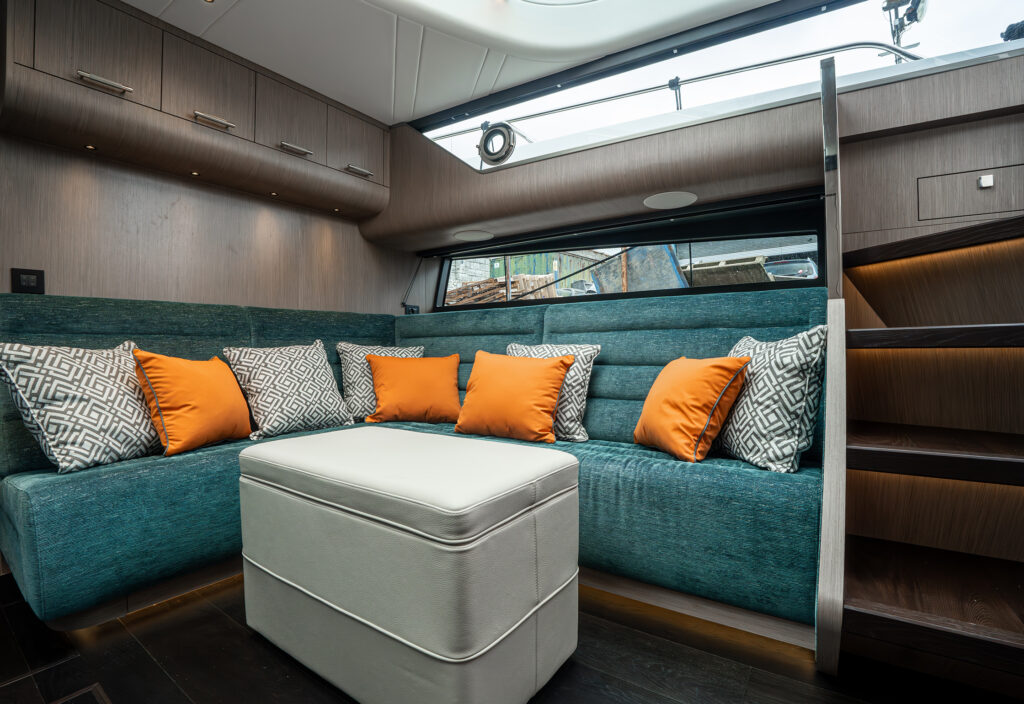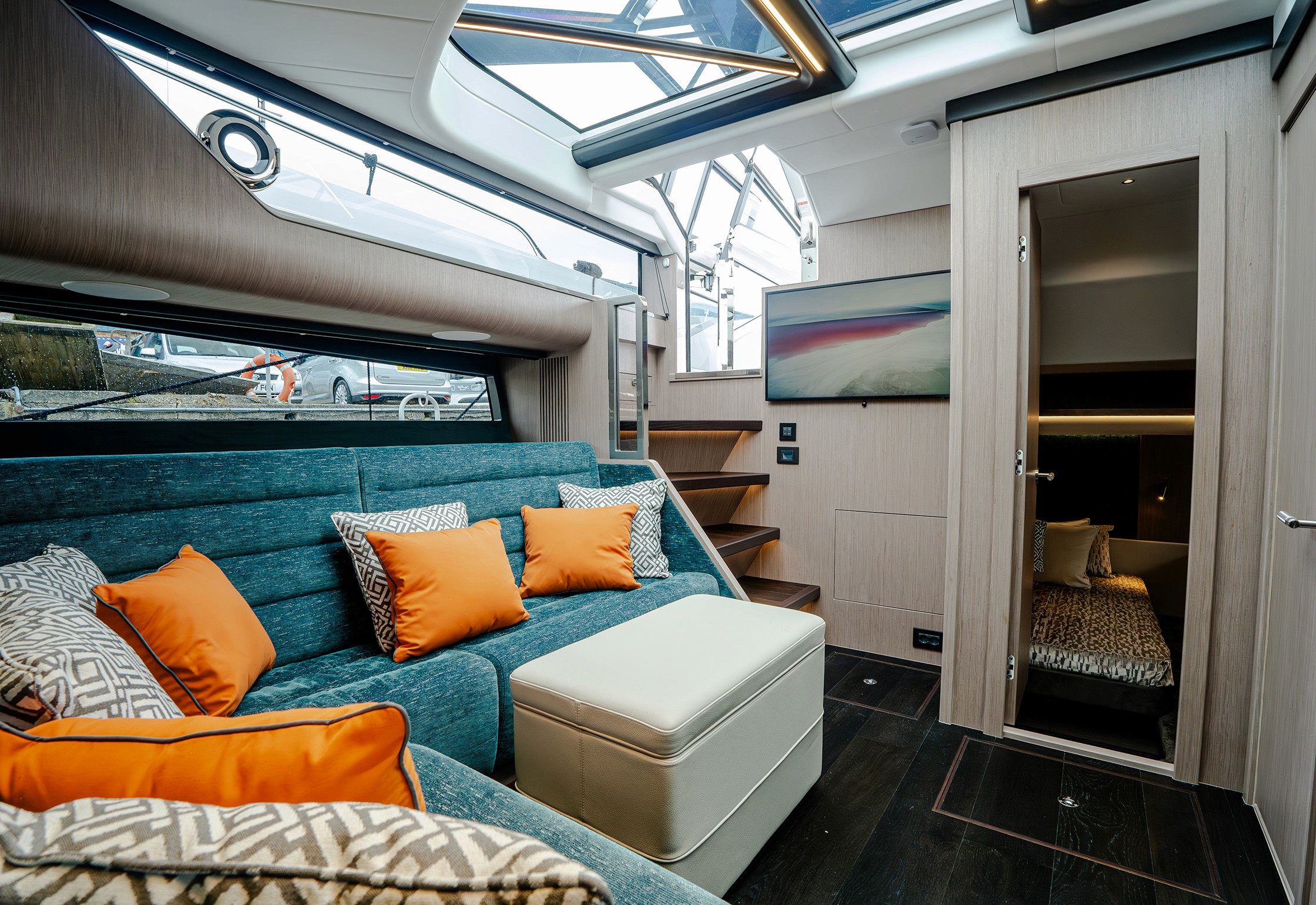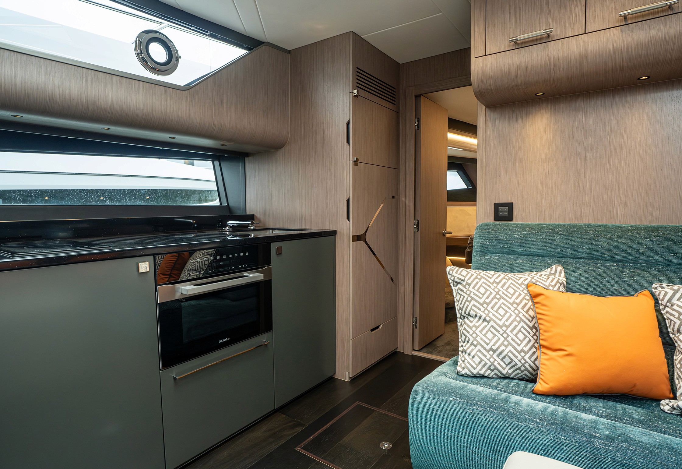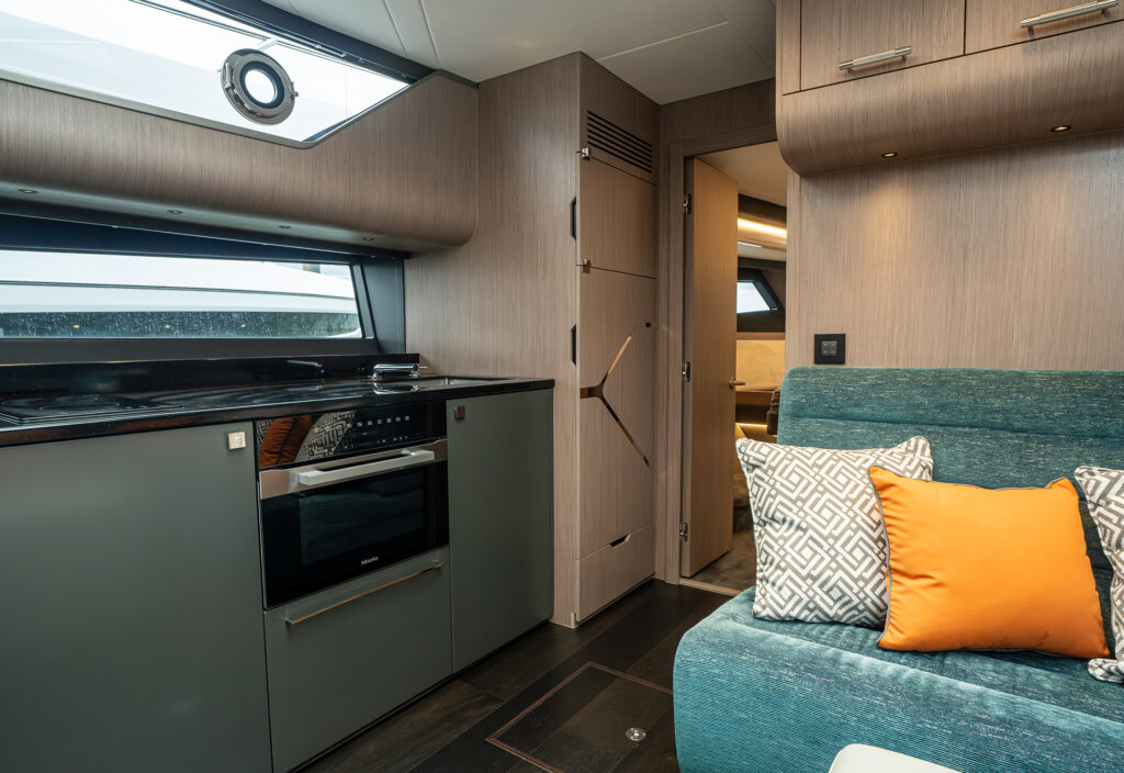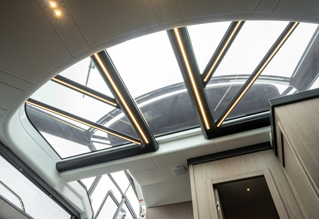 Steps lead down to a highly luxurious open plan lobby and galley area sat beneath LED lighting. Further recessed lighting, curved wood and lacquer finishes all contribute to the premium feel that truly delights those who step on board. The light floods through from the expansive screen above and electrically operated blinds allow intimacy and shade when needed.