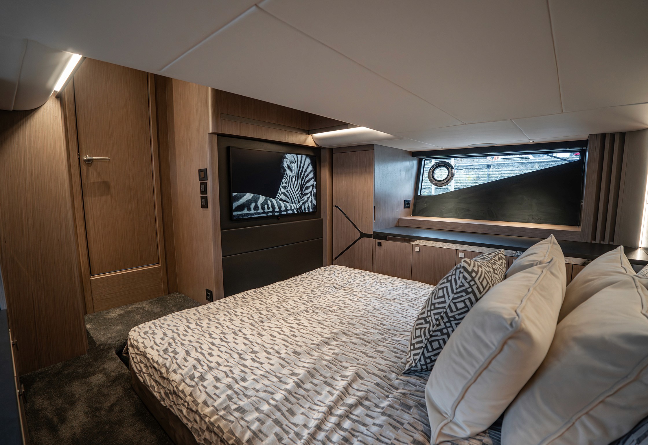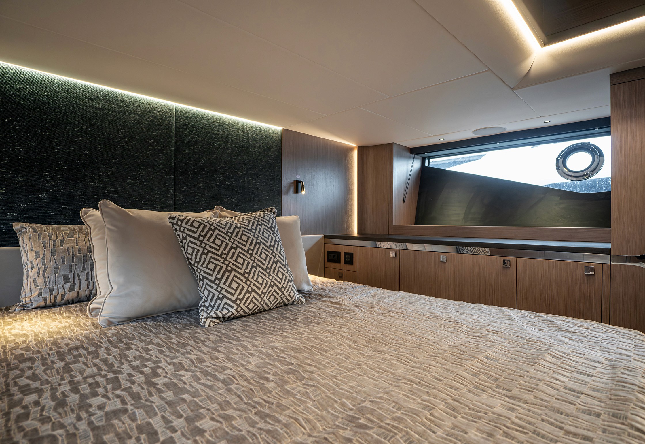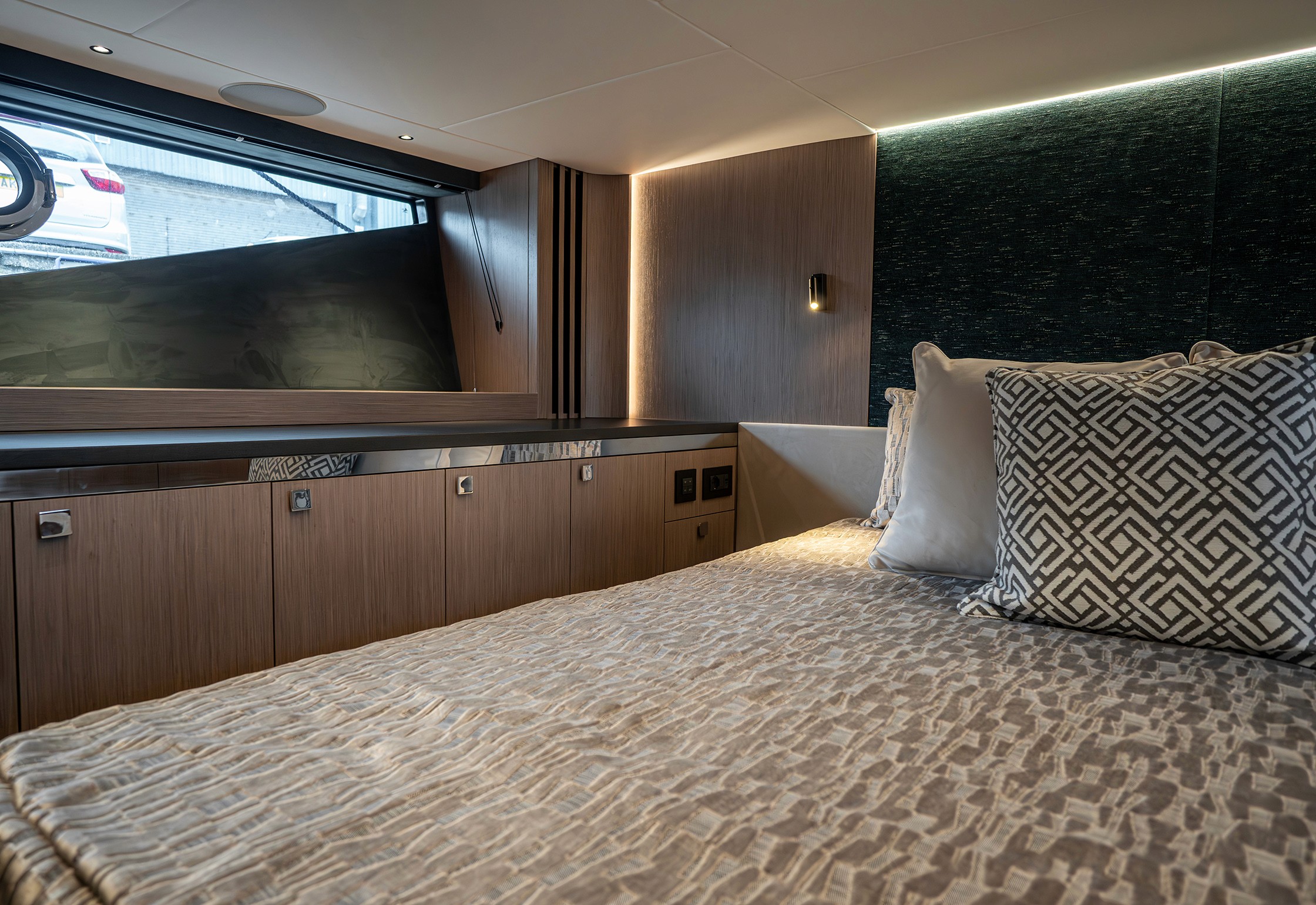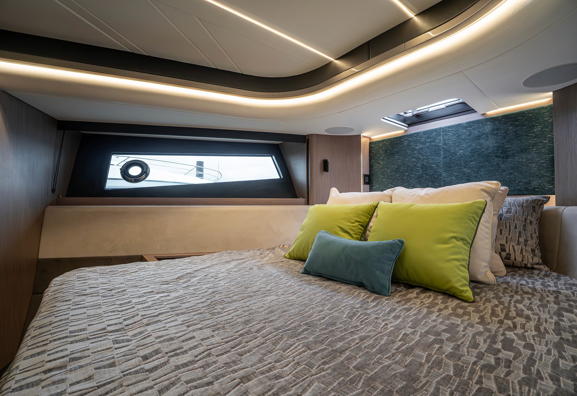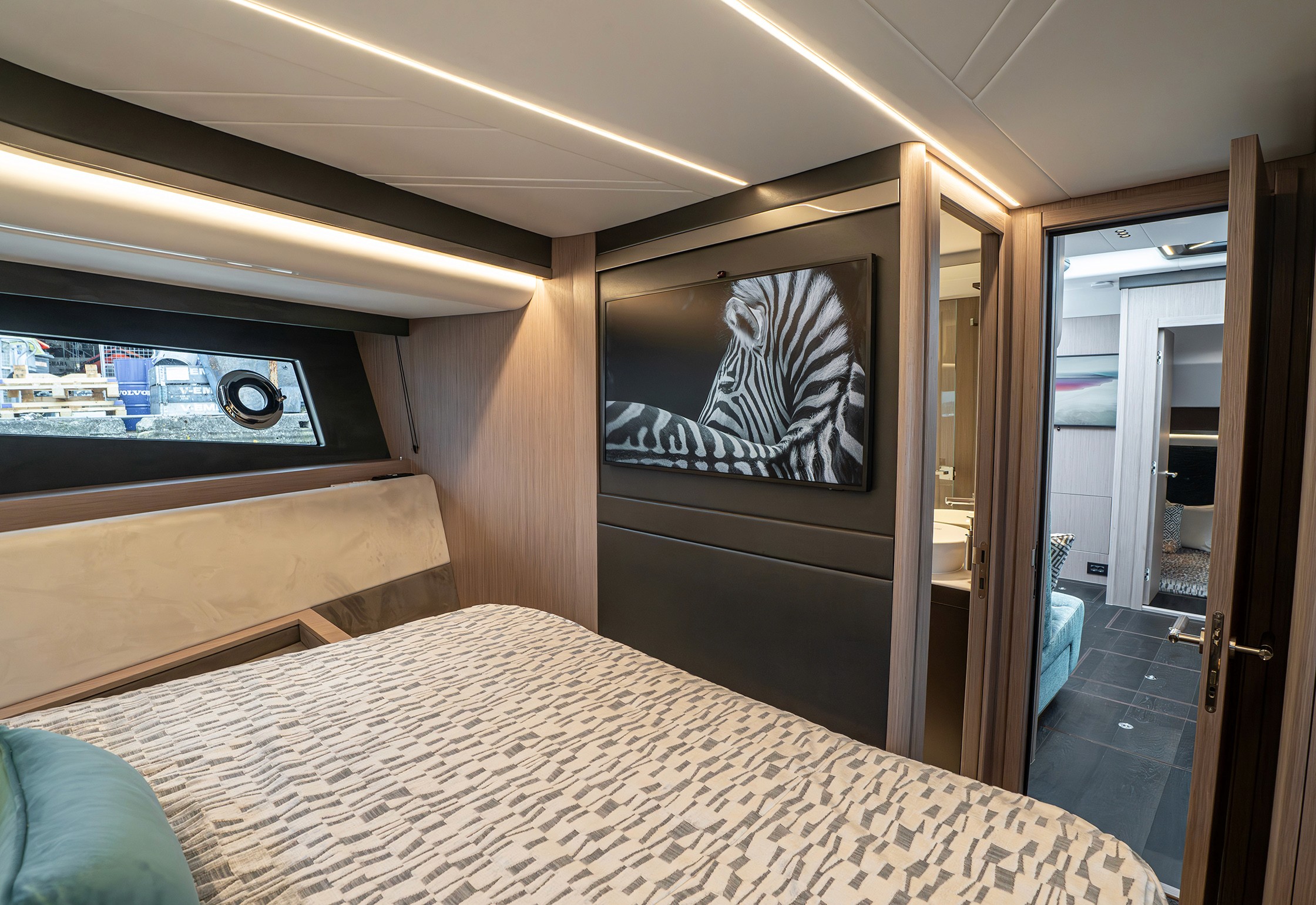 Steps lead down to a highly luxurious open plan lobby and galley area sat beneath LED lighting. Further recessed lighting, curved wood and lacquer finishes all contribute to the premium feel that truly delights those who step on board. The light floods through from the expansive screen above and electrically operated blinds allow intimacy and shade when needed.