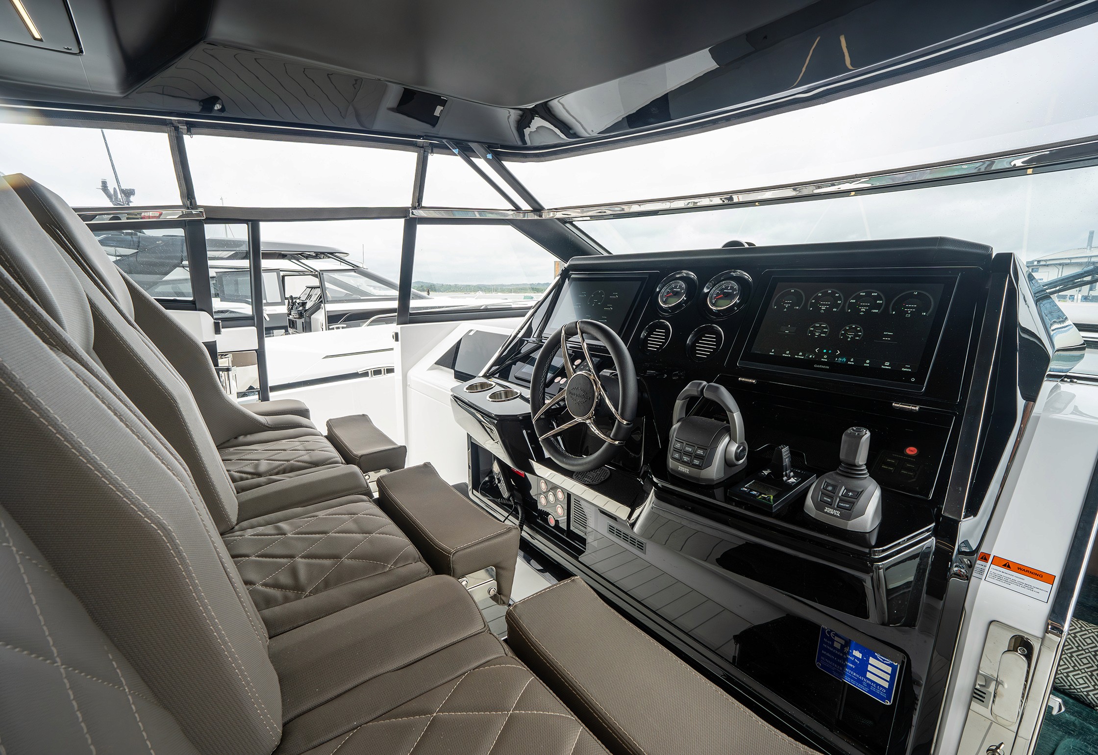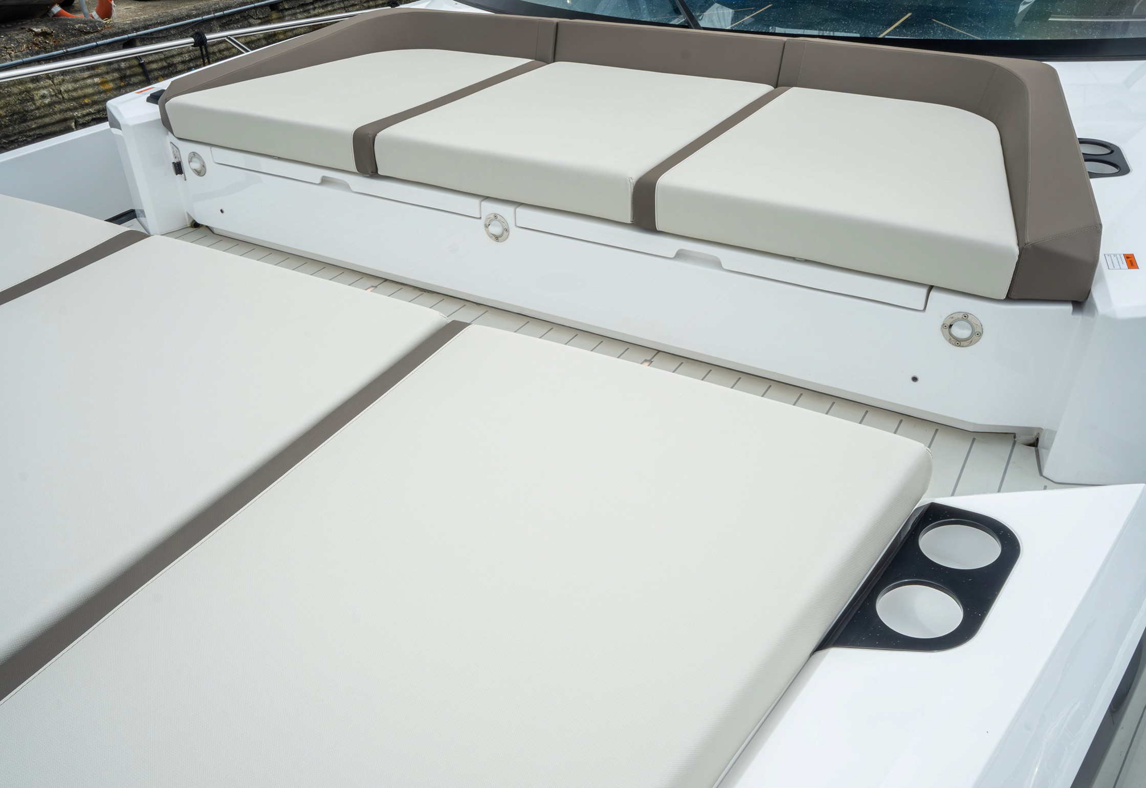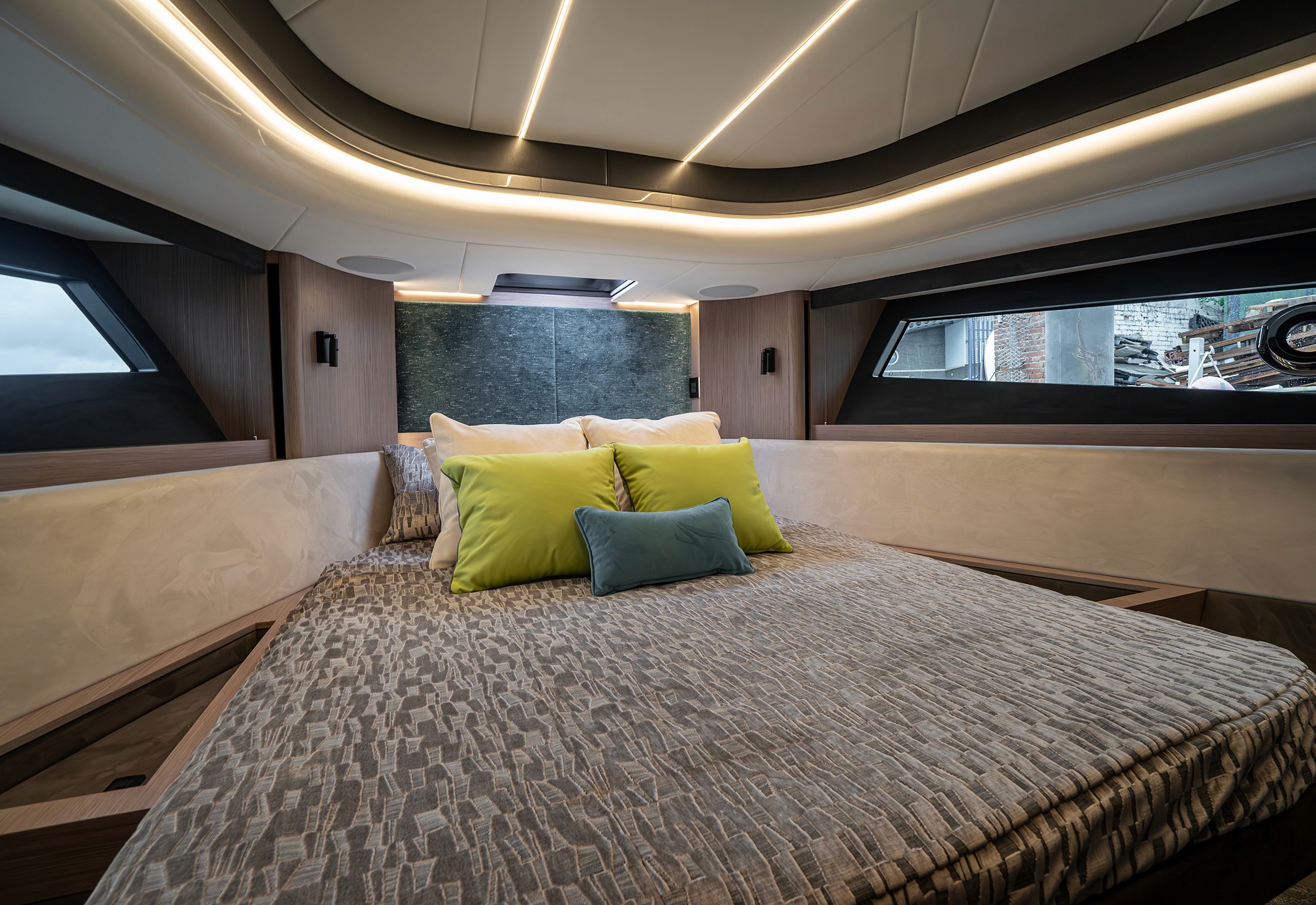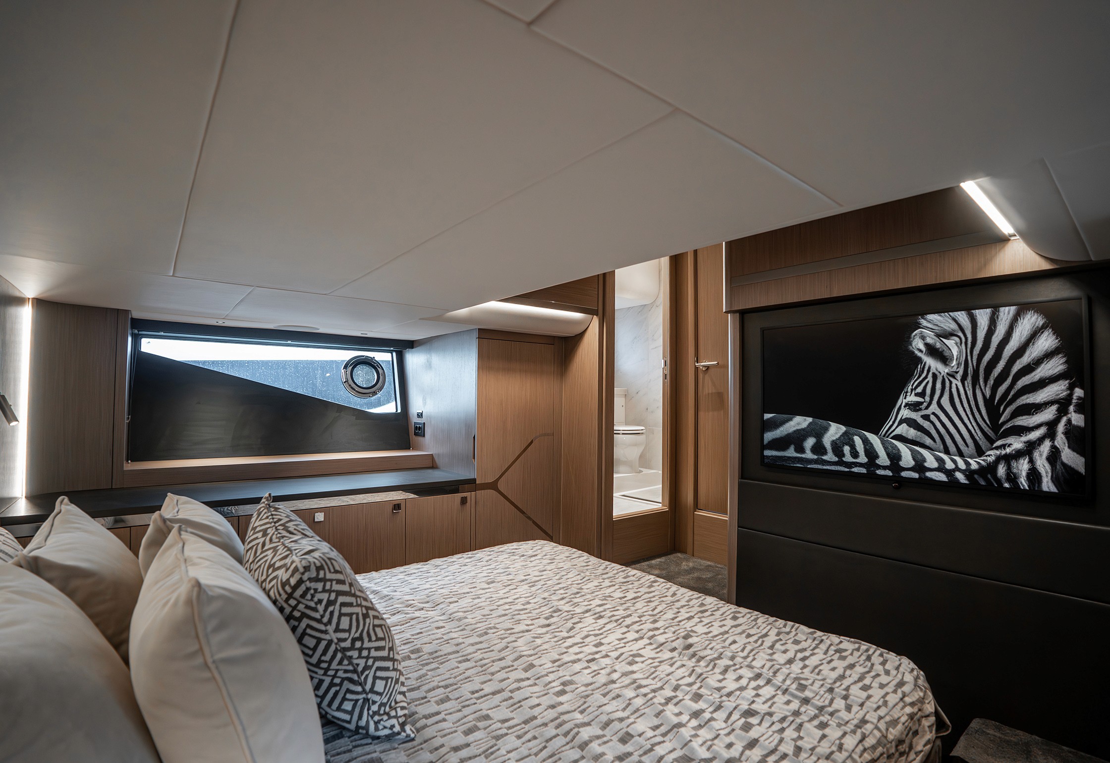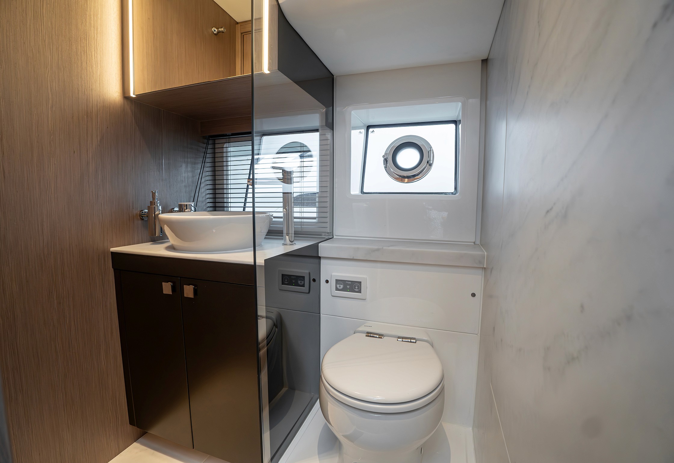 Steps lead down to a highly luxurious open plan lobby and galley area sat beneath LED lighting. Further recessed lighting, curved wood and lacquer finishes all contribute to the premium feel that truly delights those who step on board. The light floods through from the expansive screen above and electrically operated blinds allow intimacy and shade when needed.