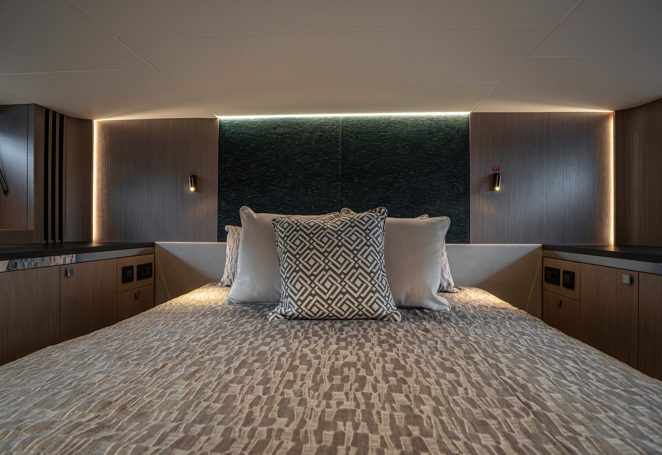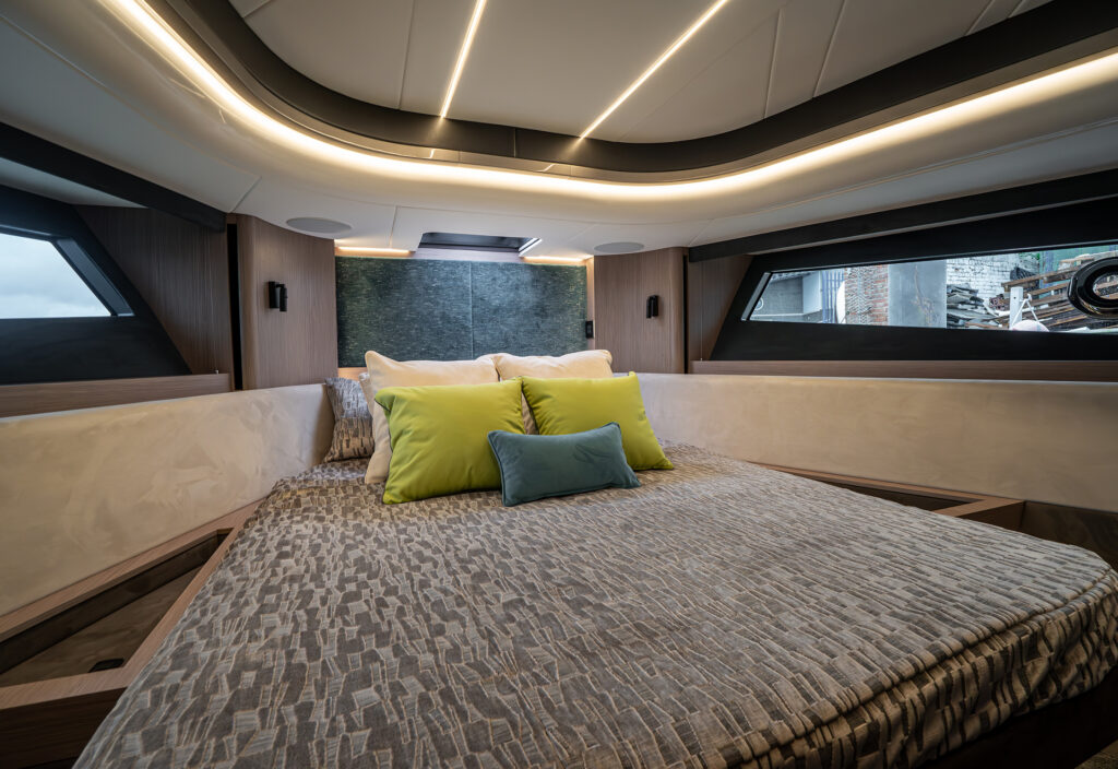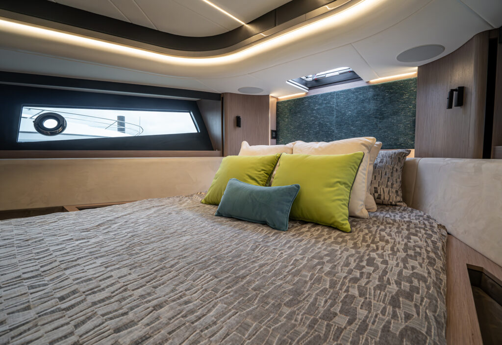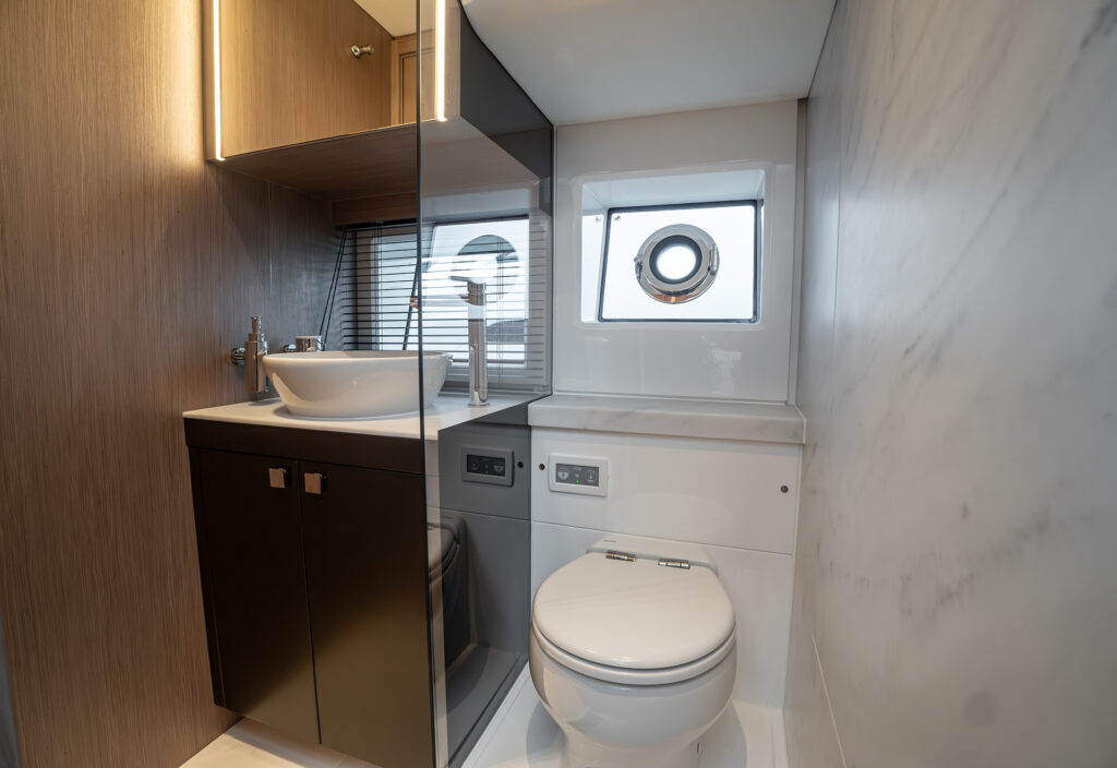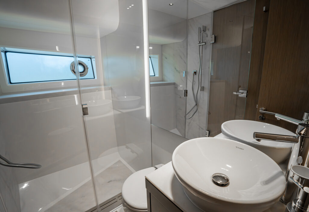 Forward is a VIP cabin with en-suite, upholstered side units and a wardrobe unit to port. There is a large bed and the interior comes with different styling palettes throughout to give a customised and personal feel to every owner.