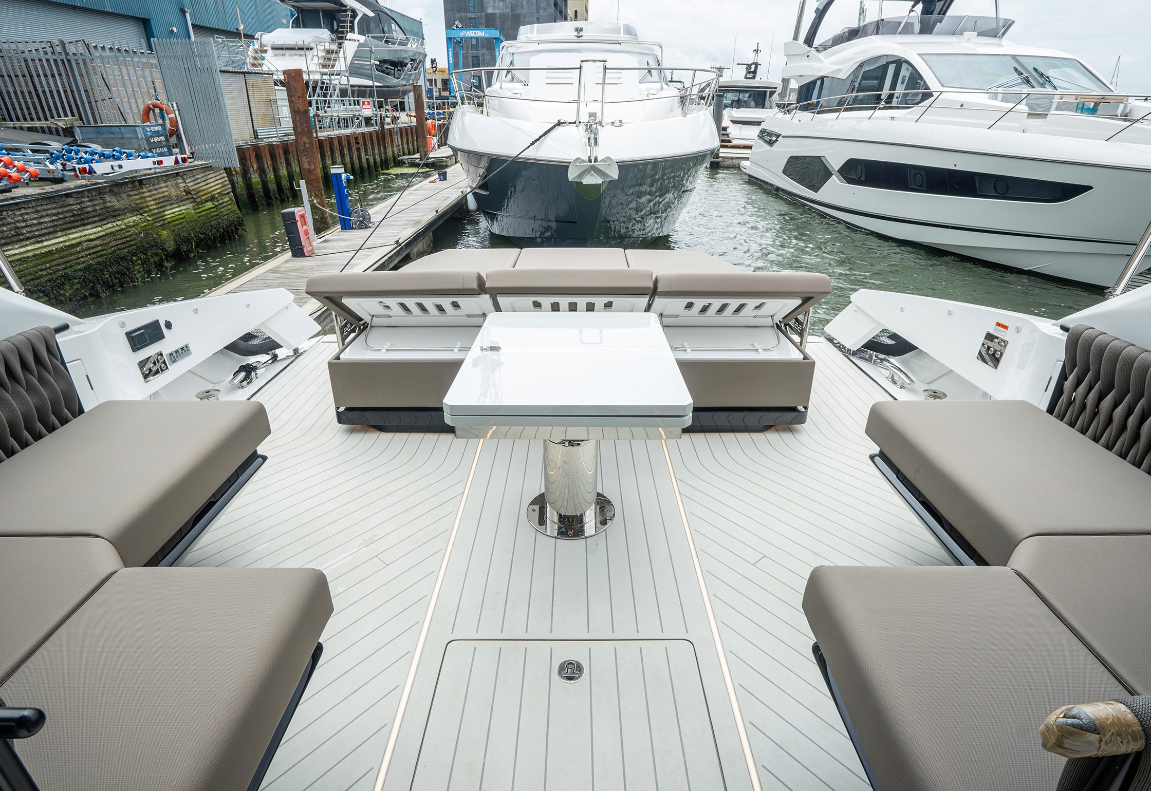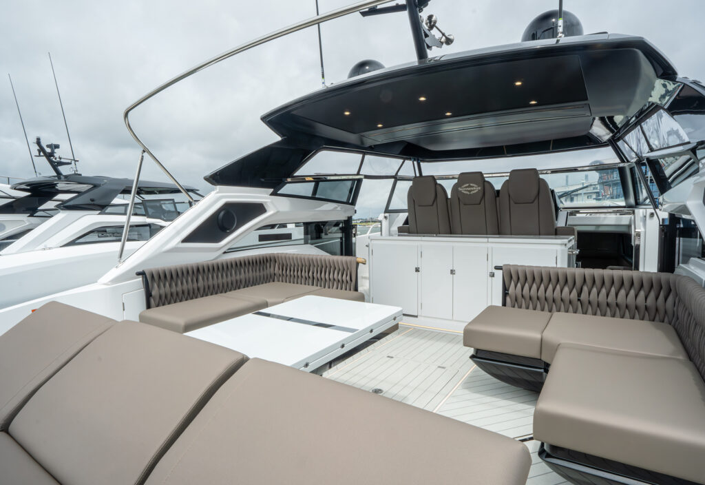 The aft cockpit is designed with a central large wet bar and several furniture configurations to make the most of the spacious deck.
